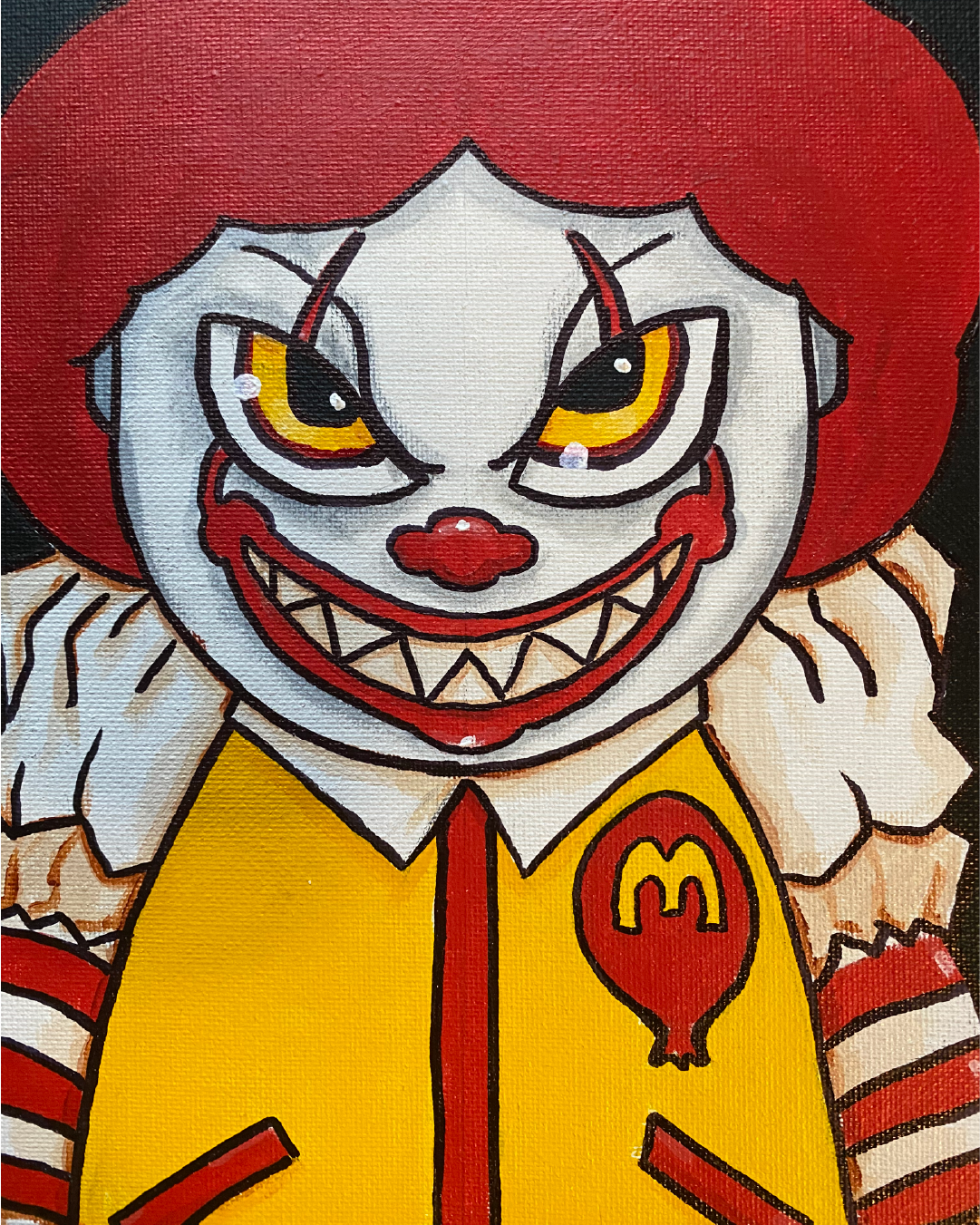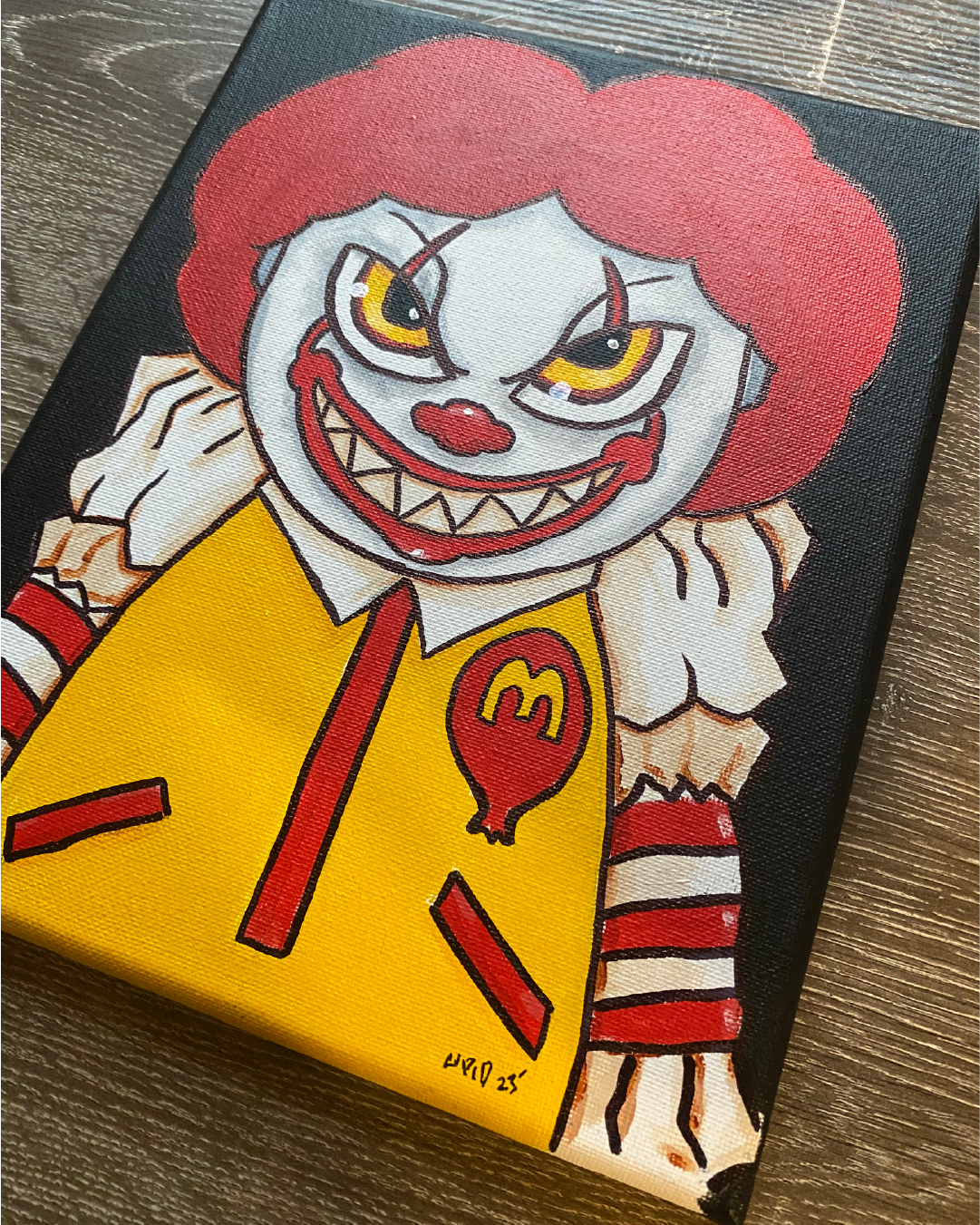 A playful yet unsettling mashup of Ronald McDonald and Pennywise the Clown, this painting blends bright, candy-colored whimsy with an undercurrent of horror. It’s fun, bold, and a little bit creepy just the way clowns should be.